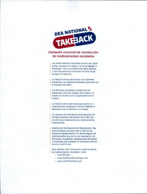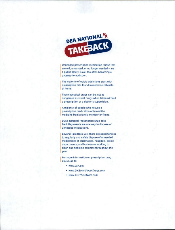 National Prescription Drug Take Back Day, From 10AM to 2PM at the Village Plaza