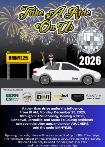 We hope everyone has a fun New Year’s Eve but please keep the roads safe by not driving under the influence. Please take advantage of the Safe Ride program (for those who plan to travel to Rio Rancho and into Bernalillo County), call a friend for a ride home or chose a designated driver when planning your evening out.